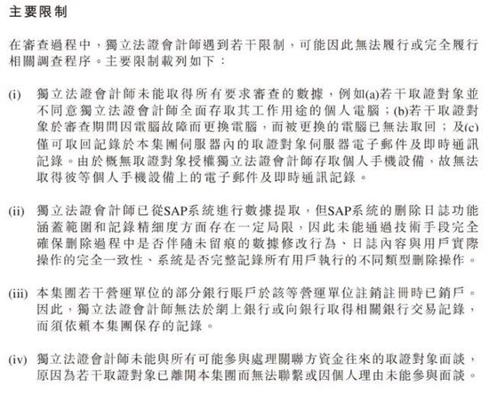另一方面则是人为因素。会计师在取证过程中,部分取证对象不同意调取工作电脑数据,或是调查期间电脑故障,换电脑后原先的无法取回;此外,一些附属公司注销导致无法获取银行交易记录,员工离职无法联系,都将导致调查无法深入。