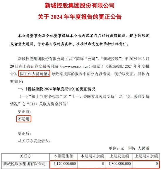 更正前,该部分内容被勾选为“不适用”,表示没有发生;更正后,新城控股披露与新城系物业经营平台、港股上市公司新城悦服务(1755.HK)在2023年、2024年分别发生18亿元、51.7亿元资金拆借。