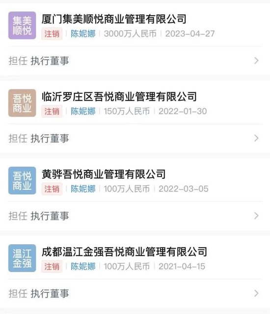 例如,新城悦服务前任CFO陈妮娜离职前,其担任执行董事和法定代表人的多家新城系子公司,自2024年4月起被陆续注销,其中包括厦门集美顺悦商业管理有限公司、临沂罗庄区吾悦商业管理有限公司、黄骅吾悦商业管理有限公司、成都温江金强吾悦商业管理有限公司。
