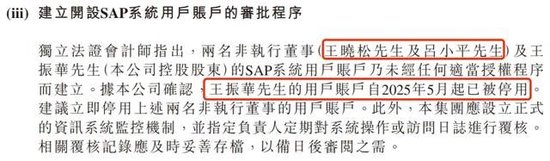 但据披露,王振华及两名非执行董事王晓松和吕小平在新城悦服务的SAP系统用户账户在非经任何授权的情况下建立,王振华的账户自2025年5月起已被停用。公司由此建议王晓松和吕小平的账户也应立即停用,并建立开设账户的审批程序。