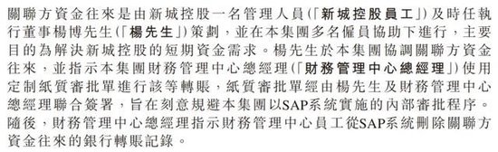 报告称,这些资金往来主要由新城控股的一名管理人员和新城悦服务时任执行董事杨博策划,目的是为了解决新城控股的短期资金需求。而为了刻意规避新城悦服务的SAP系统审批流程,专门采用了纸质审批单,转账记录也在公司财务管理中心总经理的配合下,被从SAP系统中删除。