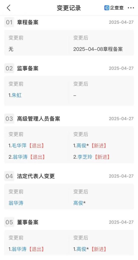 企查查显示,该公司董事、法定代表人由翁华涛变更为高俊,另一高管由毛华萍变更为李芝玲。